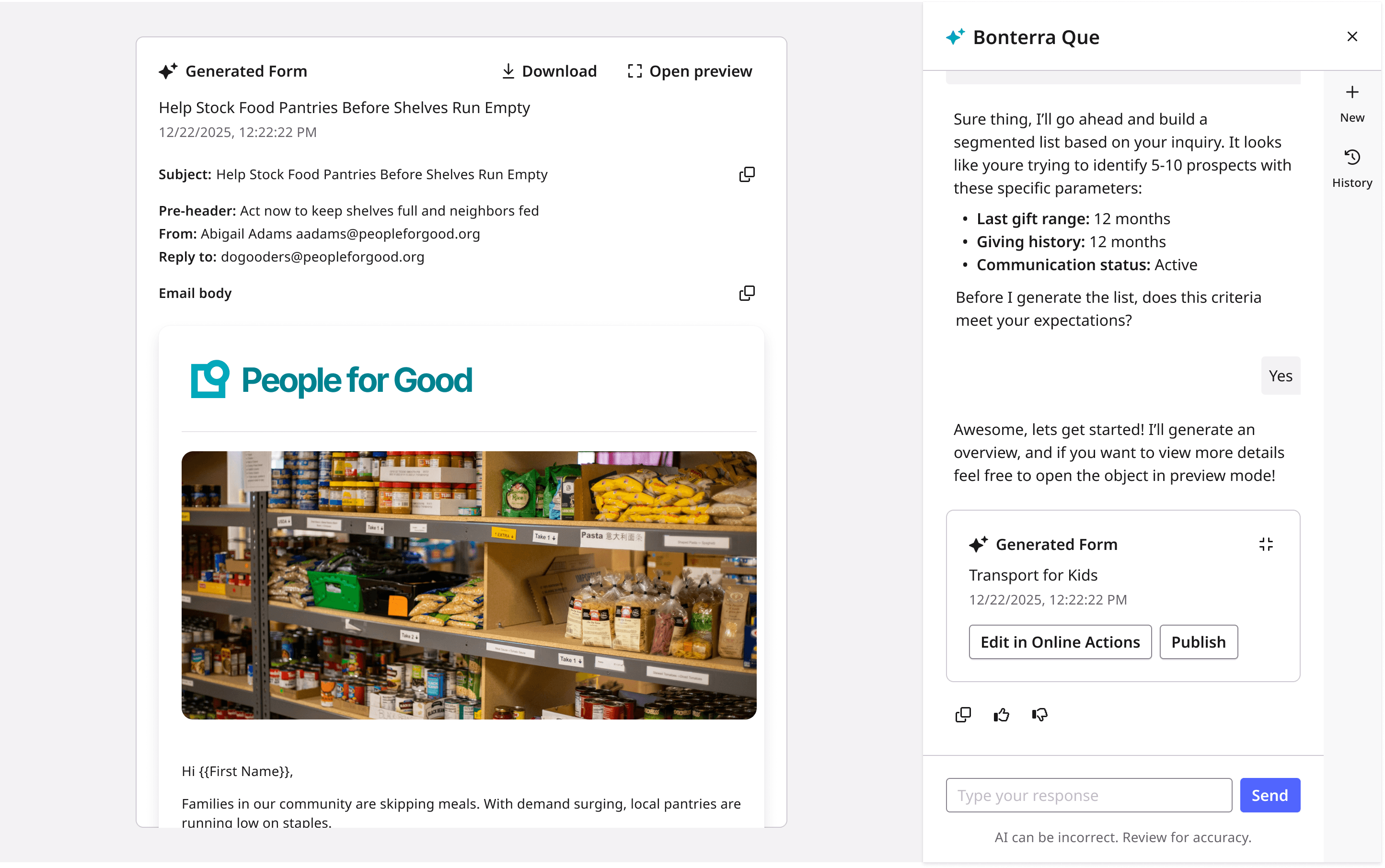 For more complex tasks like building forms or email campaigns, Que offers a preview mode that lets users review, edit, and refine their work before finalizing it. This gives fundraisers space to collaborate with the assistant, making adjustments in context and ensuring the final output feels intentional and ready to use from within the chat experience.
