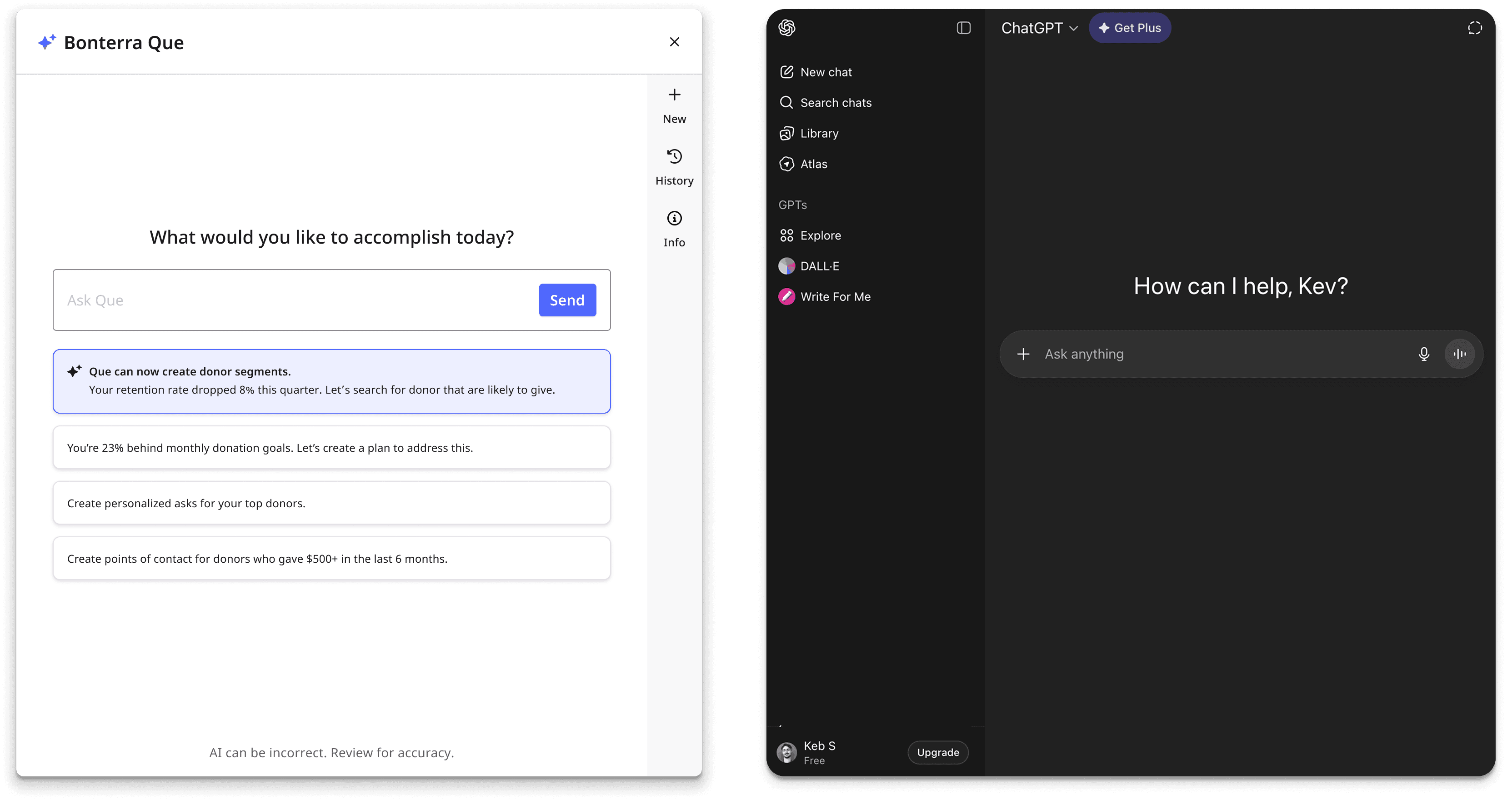 When designing Que, we looked at how other AI chatbots like ChatGPT, Claude, and Gemini to handle recommendations and guidance. This was helpful in understanding what other experiences our users may already be familiar with, as well as noticing what conversational features to look out for. Seeing how they provide context-aware suggestions and keep conversations intuitive helped us make design decisions faster and with more confidence. It also reinforced our approach: Que should feel like a helpful assistant that supports fundraisers, not replaces them.